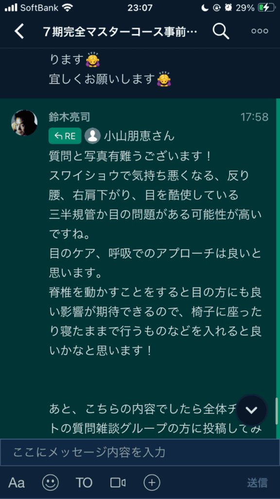 こんばんは!! すみません、自己紹介遅れました 7期の小山朋恵と言います。 先日スタートしたばかりですが、体芯力に参加させていただき毎日ワクワク過ごさせていただいています。 永野さん ご丁寧なアドバイスありがとうございます!! こんなに一つ一つ教えていただき感謝です😭✨ ヒブフレア、反り腰は私自身もなので自分にも出来そうだし、教えていただいた動きの流れだと少しずつ出来そうな気がしました!! 特にワニの呼吸、確かにうつ伏せで寝るのが楽とおっしゃってたので、積極的にお伝えしてみます!! キャットカウも呼吸を変えるとそんなに効く場所が変わるのですね!! 呼吸を変えるだけで背骨の前側、後ろ側のバランスが取れるなんて嬉しいです!! 私自身の体にも試してみたいです😍 流れも詳しく丁寧にありがとうございました!! 次のセッションでお伝えしてまた報告させていただきます🙏✨