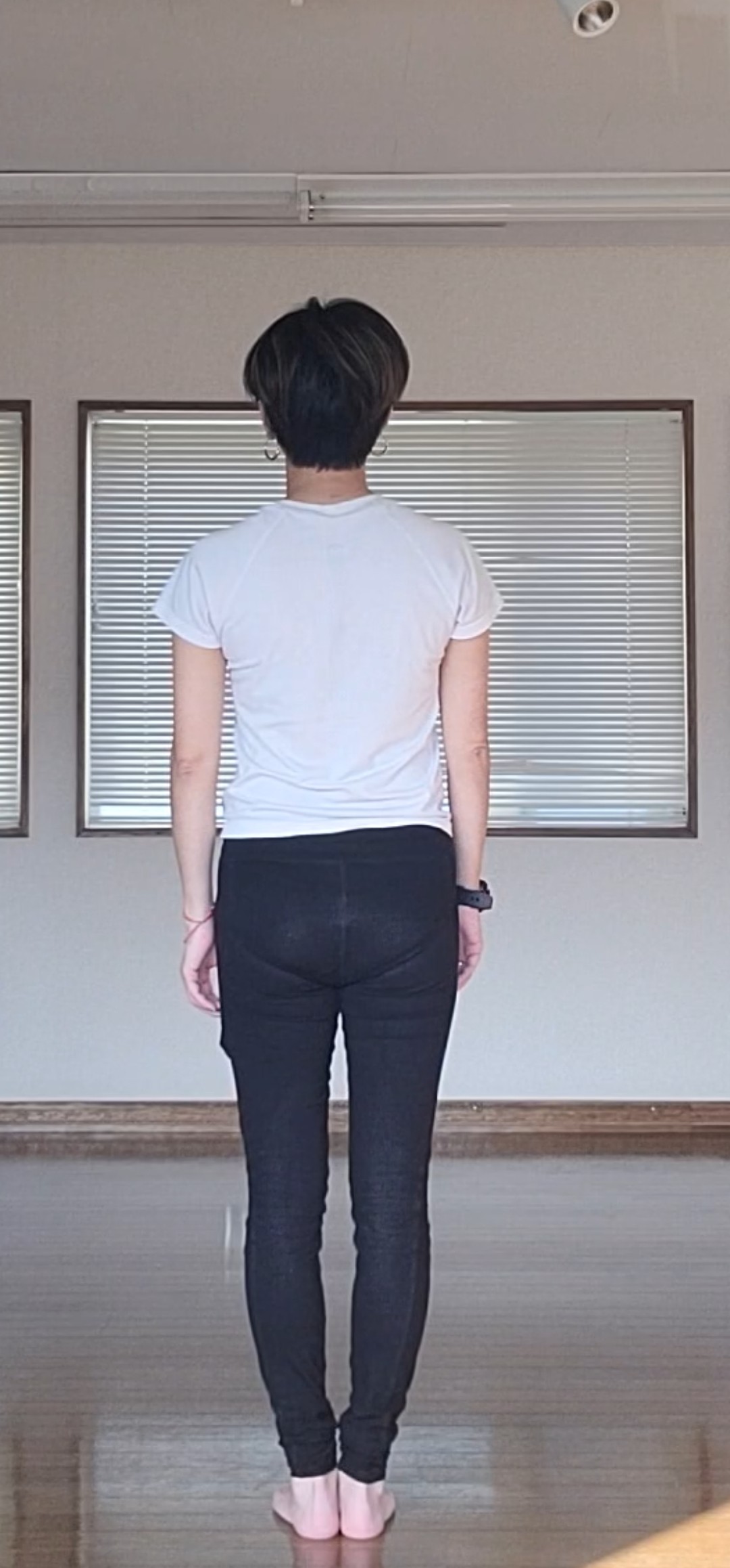 全体的に左側に身体が傾いているので 左の小脳の働きを活性化させた方が良いかな?と思います。