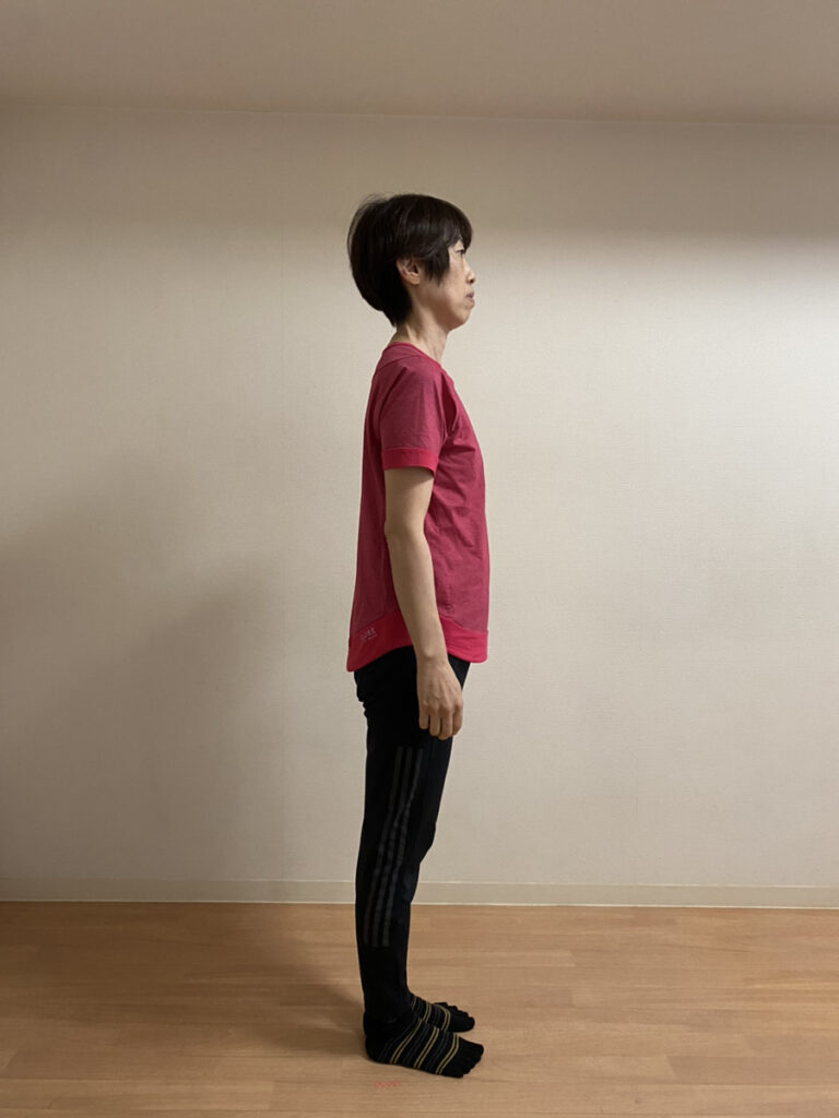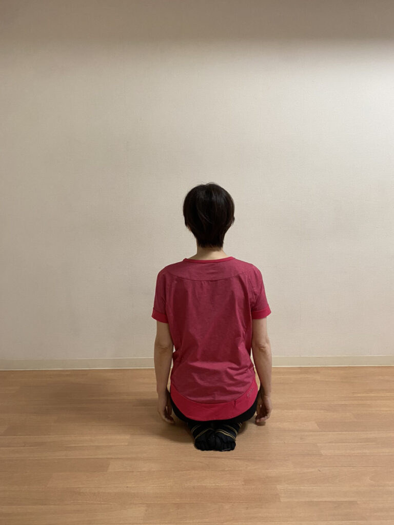 痛みを感じる動きは立つ⇄しゃがむとき。腰も背中もまっすぐにかたまって、かばっている様子。